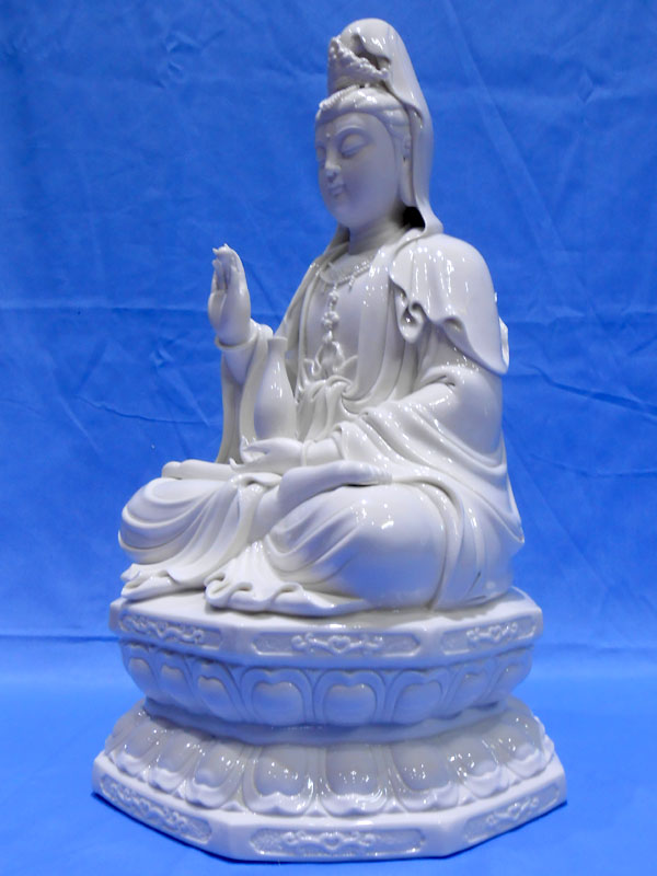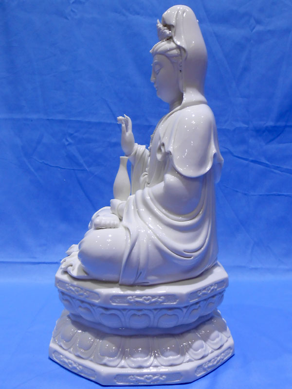 Tượng Quán Thế Âm Bồ Tát bằng sứ trắng Đài Loan Cao Cấp. Tượng cao 43cm, kích thước đế tượng 21x24 cm. Mầu men trắng tinh khiết của tượng mô tả một trong các thân tướng của ngài là Bạch Y Quán Âm, được xem như là vị Bồ Tát giúp phụ nữ hiếm muộn.