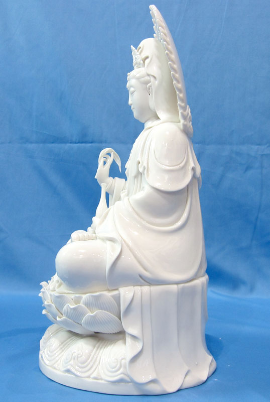 Tượng Quan Thế Âm Bồ Tát ngồi kiết già bằng sứ trắng tinh khiết. Cao 40cm. Xuất xứ Trung Quốc