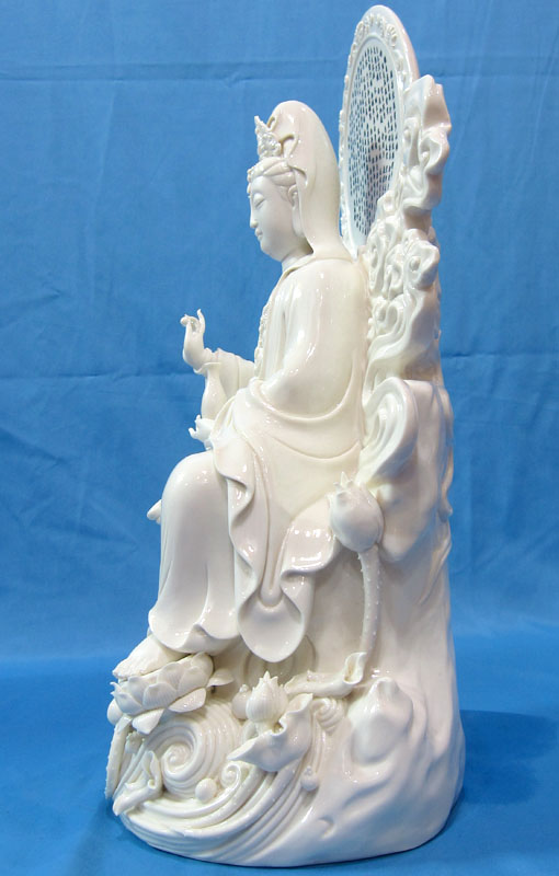 Tượng Quán Thế Âm Bồ Tát tọa trên đài sen bằng sứ trắng tinh, phía sau có bài Bát Nhã Tâm Kinh. Tượng cao 50cm